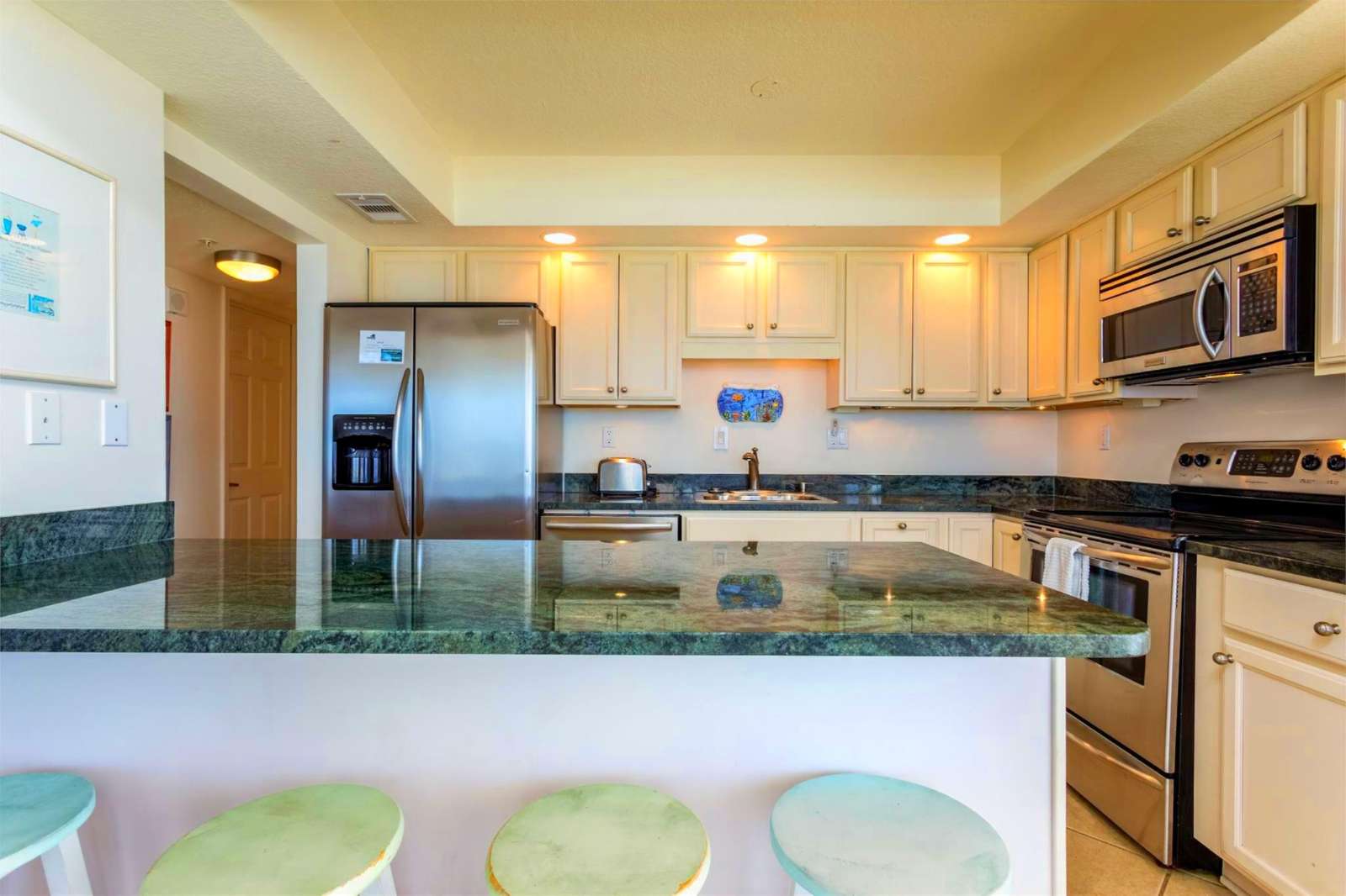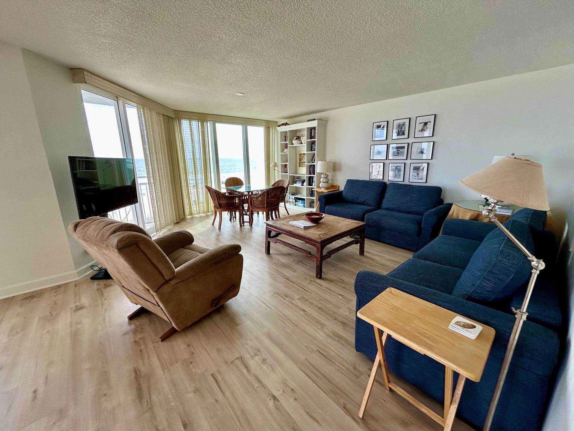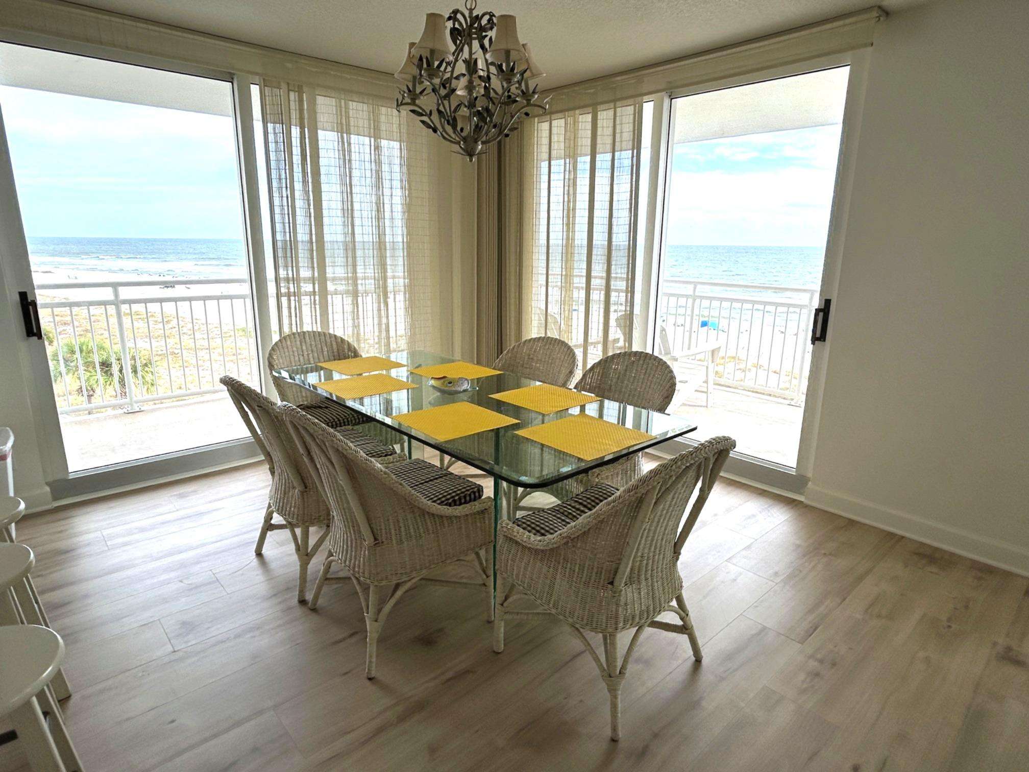 This gorgeous 3 bedroom / 3 bath condo has the most breathtaking views of the Gulf of Mexico from the incredible wrap around balcony! You and your family and friends can sit and watch the sun rise or set with your mimosa in your hands and you'll never get tired of these views! The unit sleeps 8, comfortably, with a king sized bed in the master bedroom, a queen sized bed as well as a twin over double bunk-bed in the second bedroom, and another king size bed in the third bedroom! WOW! There is so much space for family and friends that you'll be sure to make great memories in this condo! The kitchen boasts of granite counter tops, stainless steel appliances and all the bells and whistles that even the most seasoned cook will enjoy. For all you coffee lovers this unit offers both a Keurig and a drip coffee maker. There are Gulf views from the master bedroom, guest bedroom, and even the living room and dining room areas. What a great way to start the day, just rolling over and opening your eyes to see the beach! Remember, while on the property, to enjoy the three refreshing pools, hot tub, newly resurfaced tennis/pickleball court, marina with boat slip, kayak rack, grilling area for your fresh catch, and our well equipped beach front gym! You truly can relax and enjoy yourself at this property. Book now before it's gone!